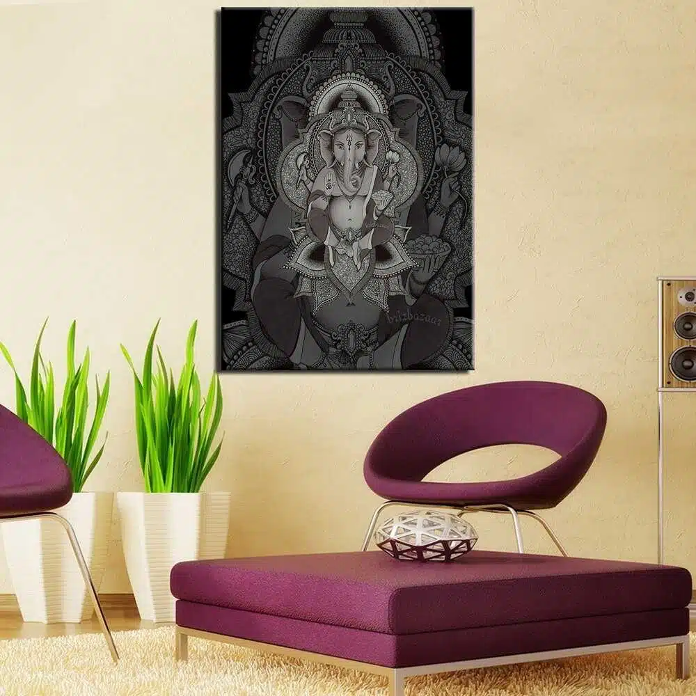 Den här överdådiga målningen föreställer Ganesh, den hinduiska elefantguden. Myten och symboliken kring honom gör honom till en av de mest vördade gudarna i Indien och andra asiatiska länder. Han kommer att ge en lugnande och andlig atmosfär till ditt hem.
