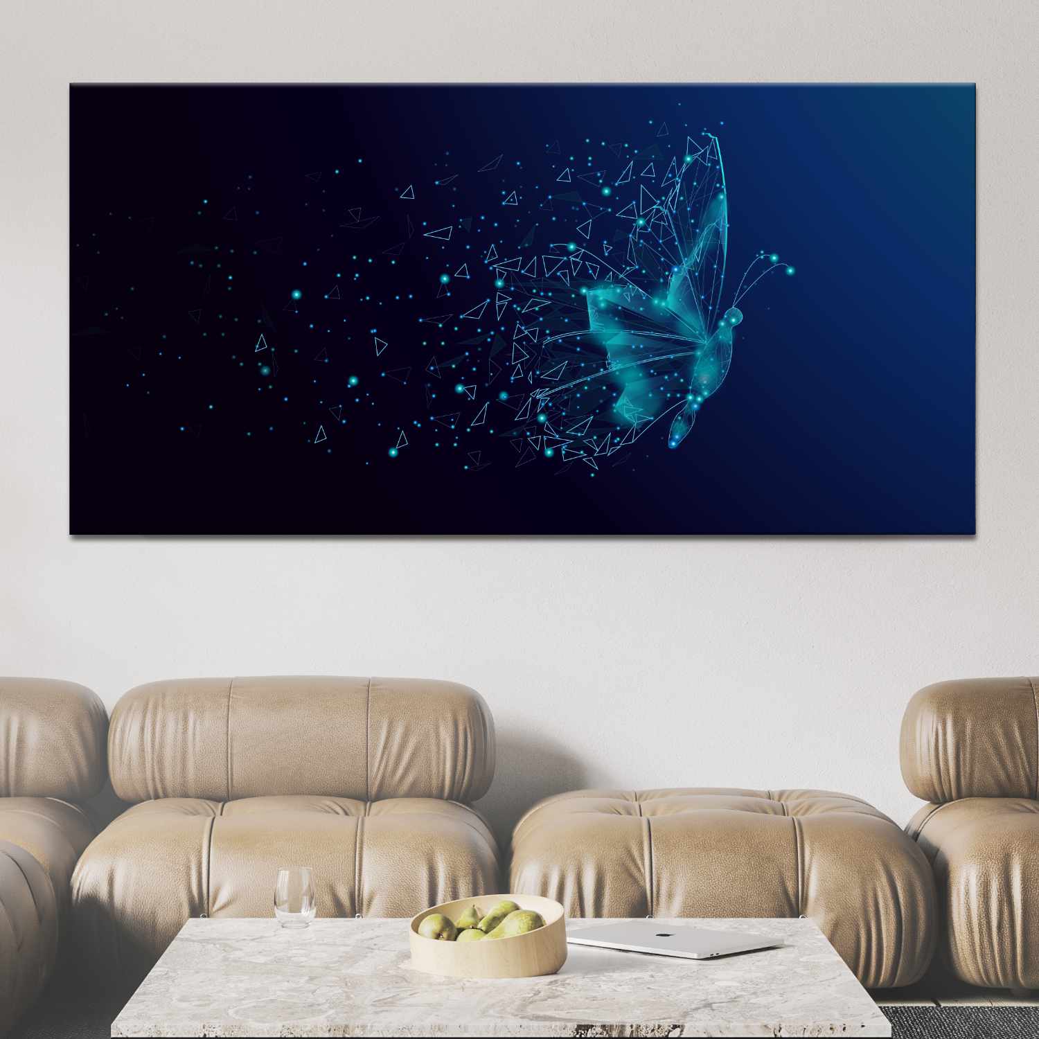 Det här konstverket föreställer en digital blå fjäril som lyser på en svart bakgrund. En målning i futuristisk stil för naturälskare.