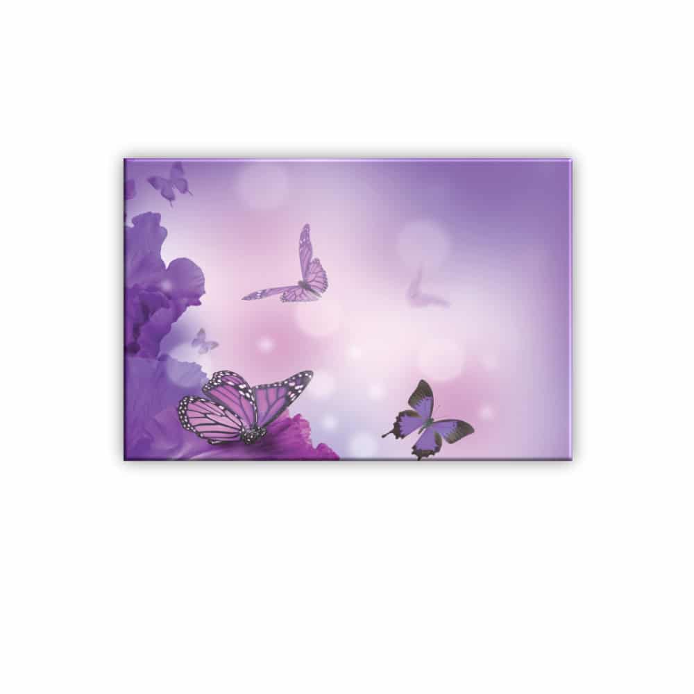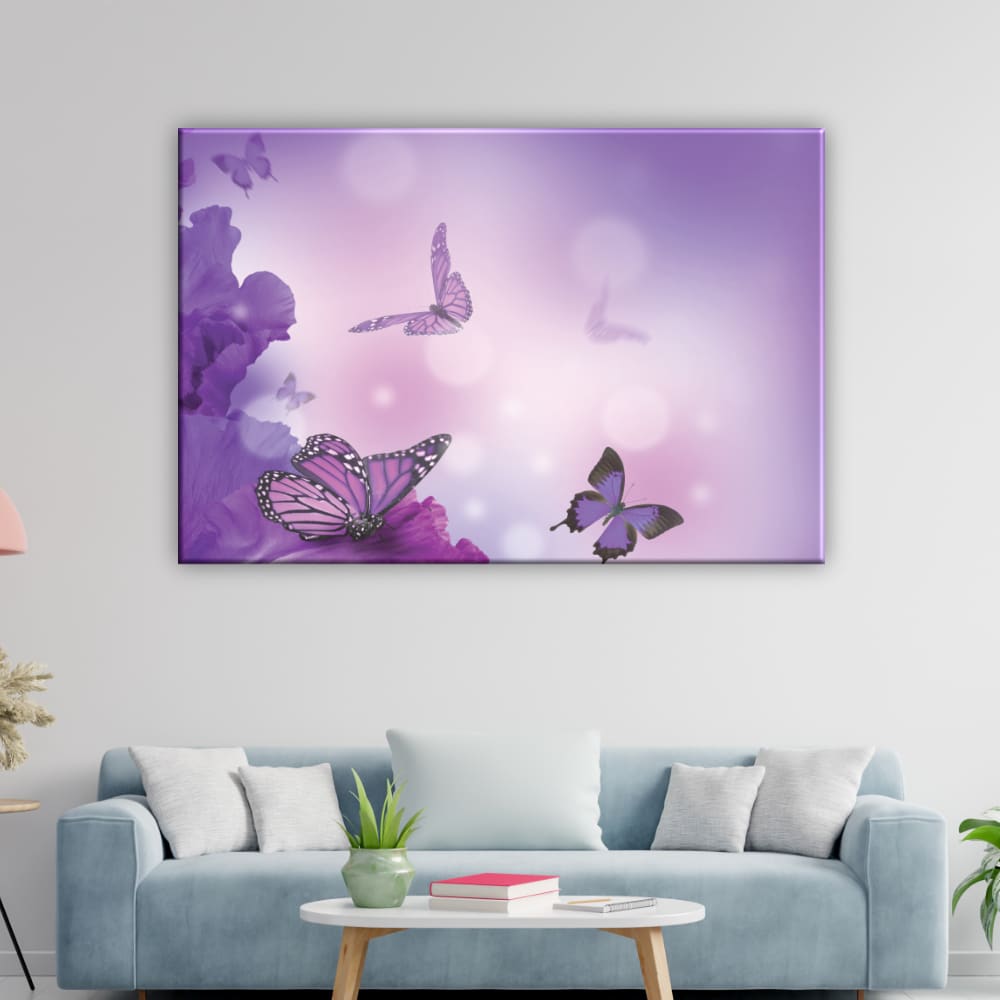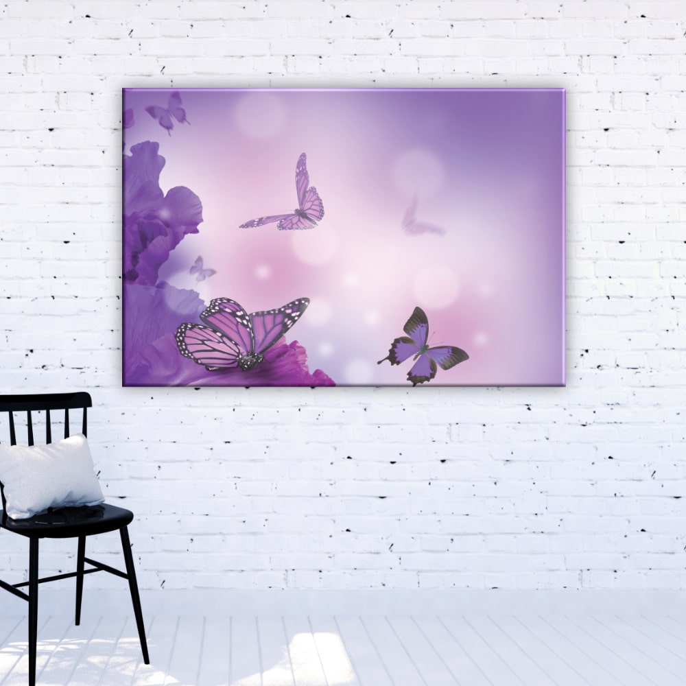 Den här lila fjärilsmålningen föreställer glittrande fjärilar. En ljus och varm touch i ditt hem för att förändra ditt hem från dag till natt.