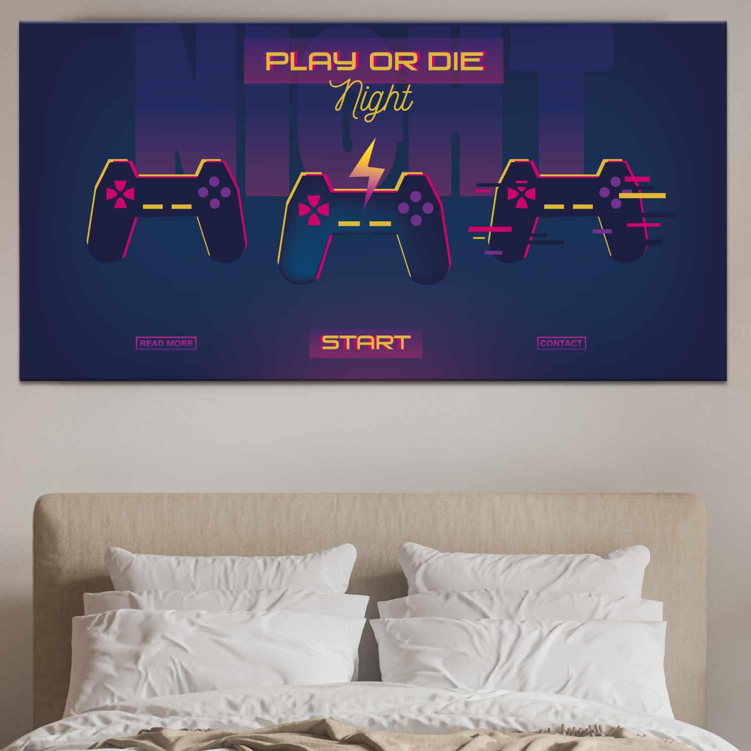 Det här konstverket föreställer startskärmen i spelet “Play or Die” där spelarna spelar hela natten. En perfekt gåva för videospelsfantaster.