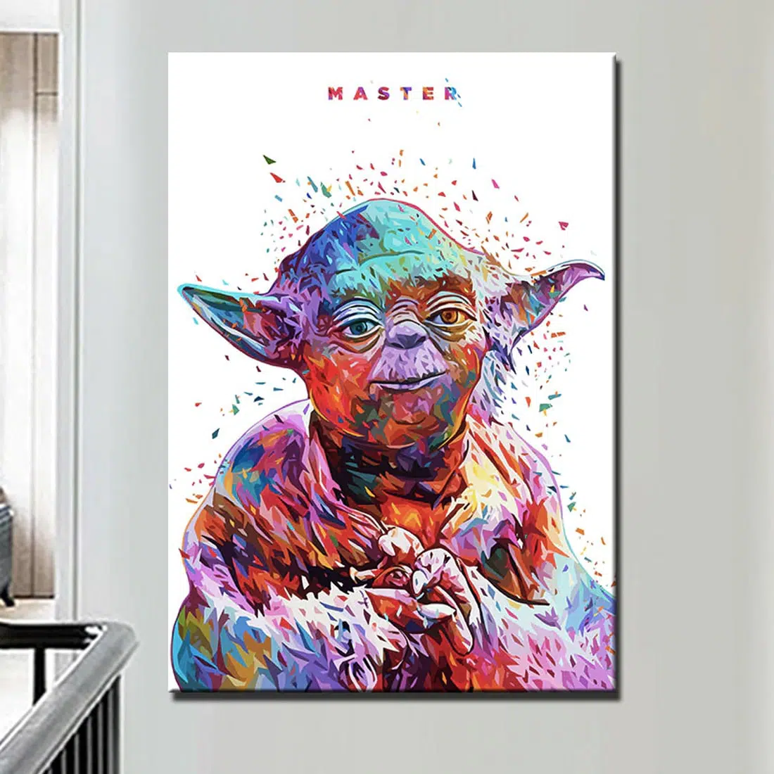 Den här målningen föreställer den berömda mästaren Yoda i en designad och färgstark stil. Den vita bakgrunden som förstärks av färgen ger en modern touch.