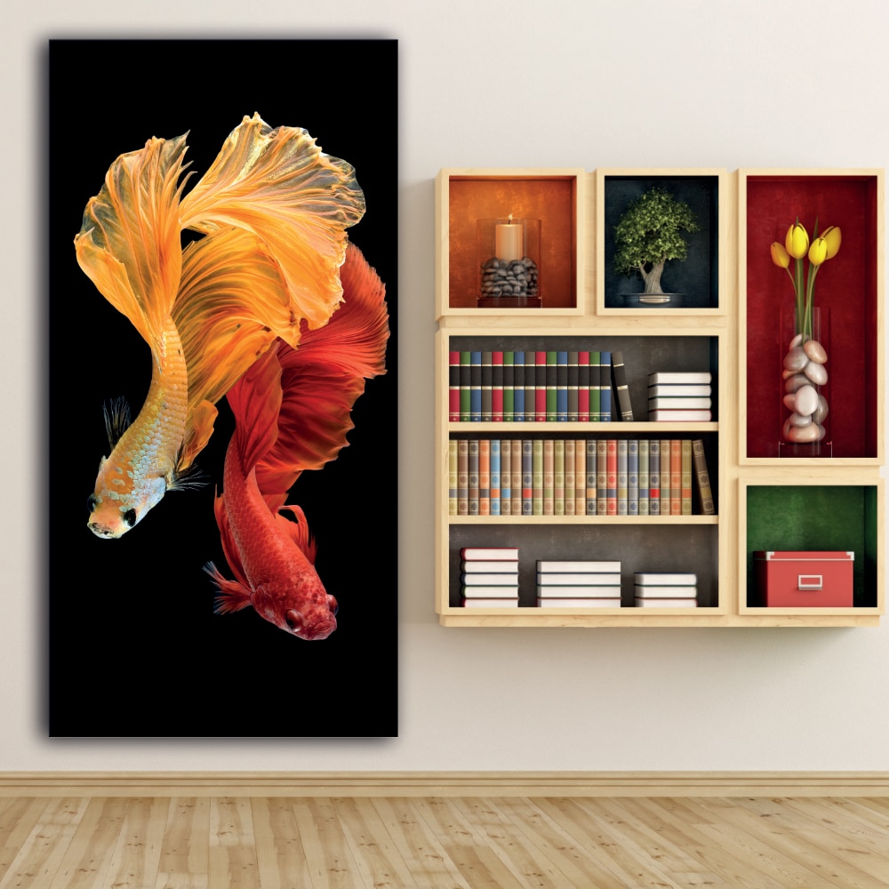 Visste du det? Dessa fiskar är inte avsedda att leva tillsammans med andra fiskar av samma art. Det är troligt att de kommer att slåss till döden. Den här målningen “Gul och orange siamesisk kampfisk” ger oss ett intryck av rörelse, liv, aggressivitet och motstånd. Tack vare dessa explosiva färger kan du dessutom sätta lite pepp i din inredning. Fånga dina gästers uppmärksamhet!