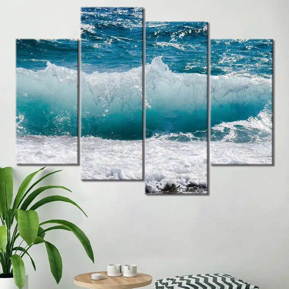 Den här målningen föreställer en våg som bryts. Det vita skummet från den föregående vågen drar sig försiktigt tillbaka. Havets rörelse, som är så lugnande, kommer att ge din inredning en avslappnande touch.