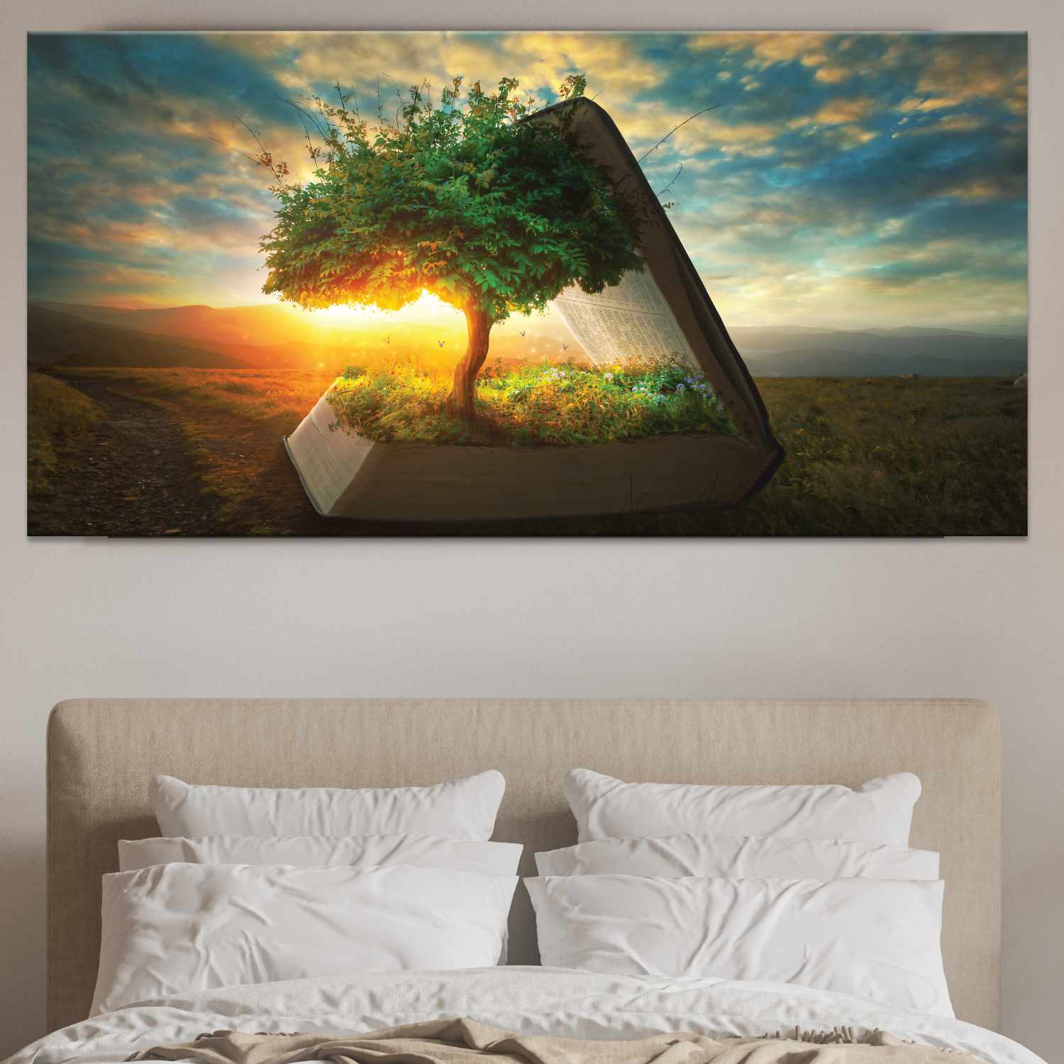 Den här målningen representerar naturens bok och visar ett träd som växer inuti en gigantisk bok genom att hålla den öppen. En poetisk målning som på ett naturligt sätt kommer att ge mjukhet.