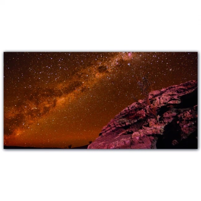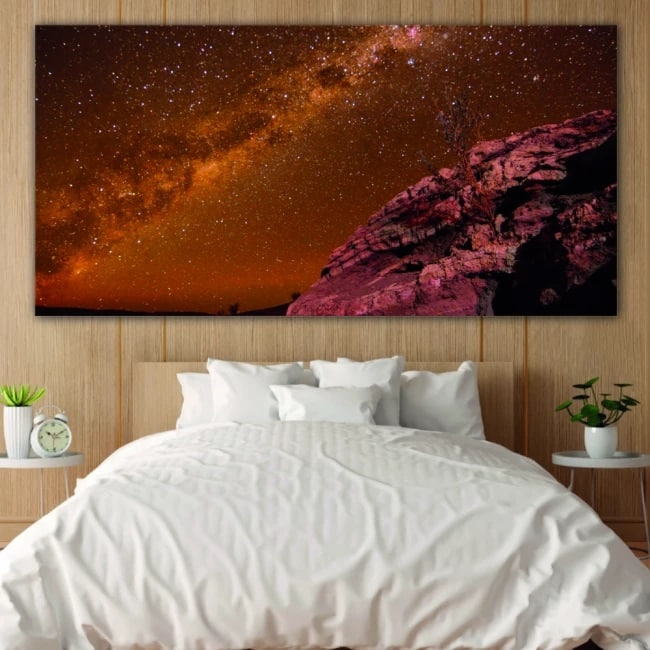 Låt dig själv få stunder under dagen för att bli förvånad över stjärnorna och se ut i universums vidder med den här kraftfulla landskapsmålningen med röda stenar och milky way.