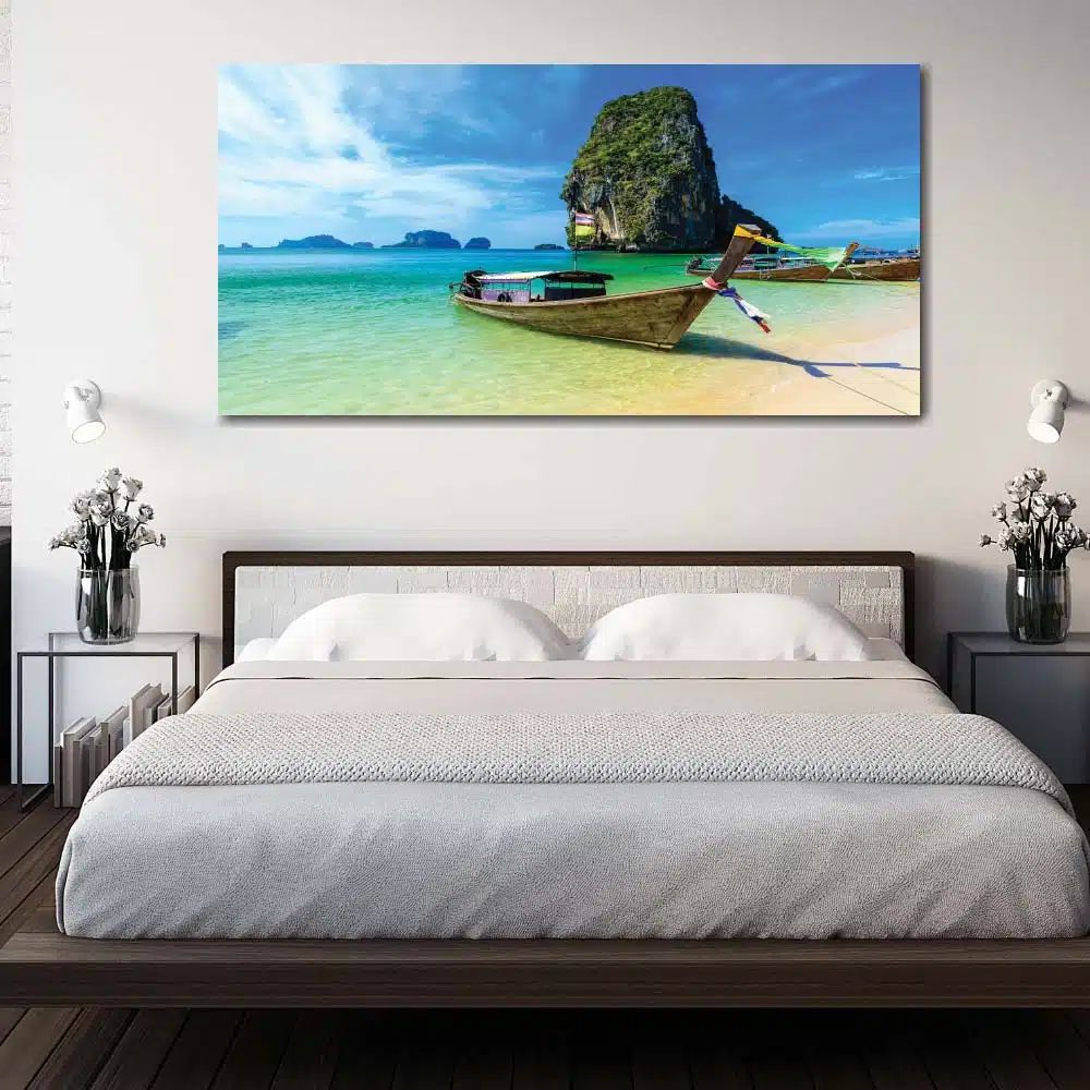 Utan tvekan är den här målningen det bästa sättet att dra uppmärksamhet till ditt vardagsrum. Färgerna i det turkosa vattnet och den lugna aspekten av den här målningen tar dig med på en resa och lyser upp din inredning.