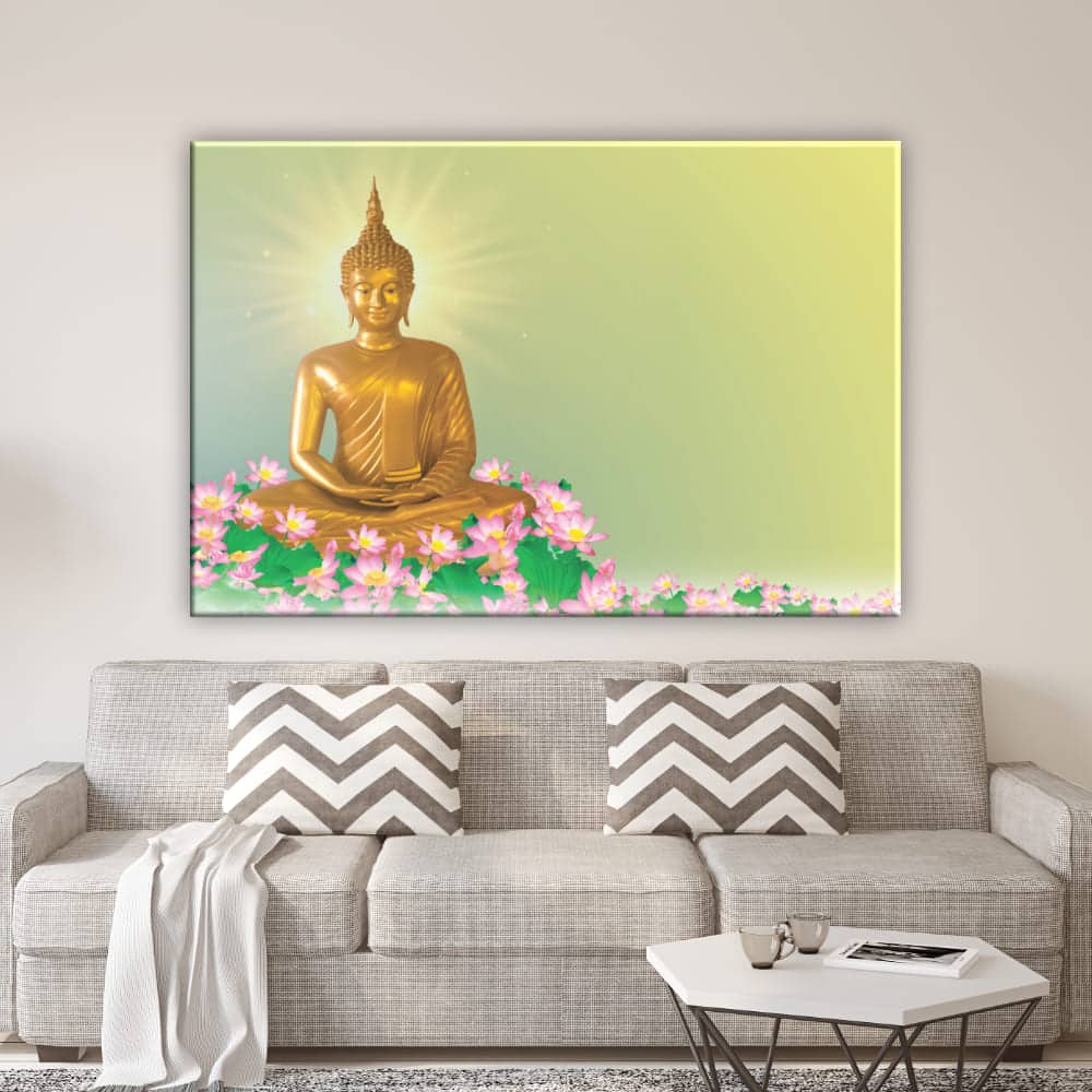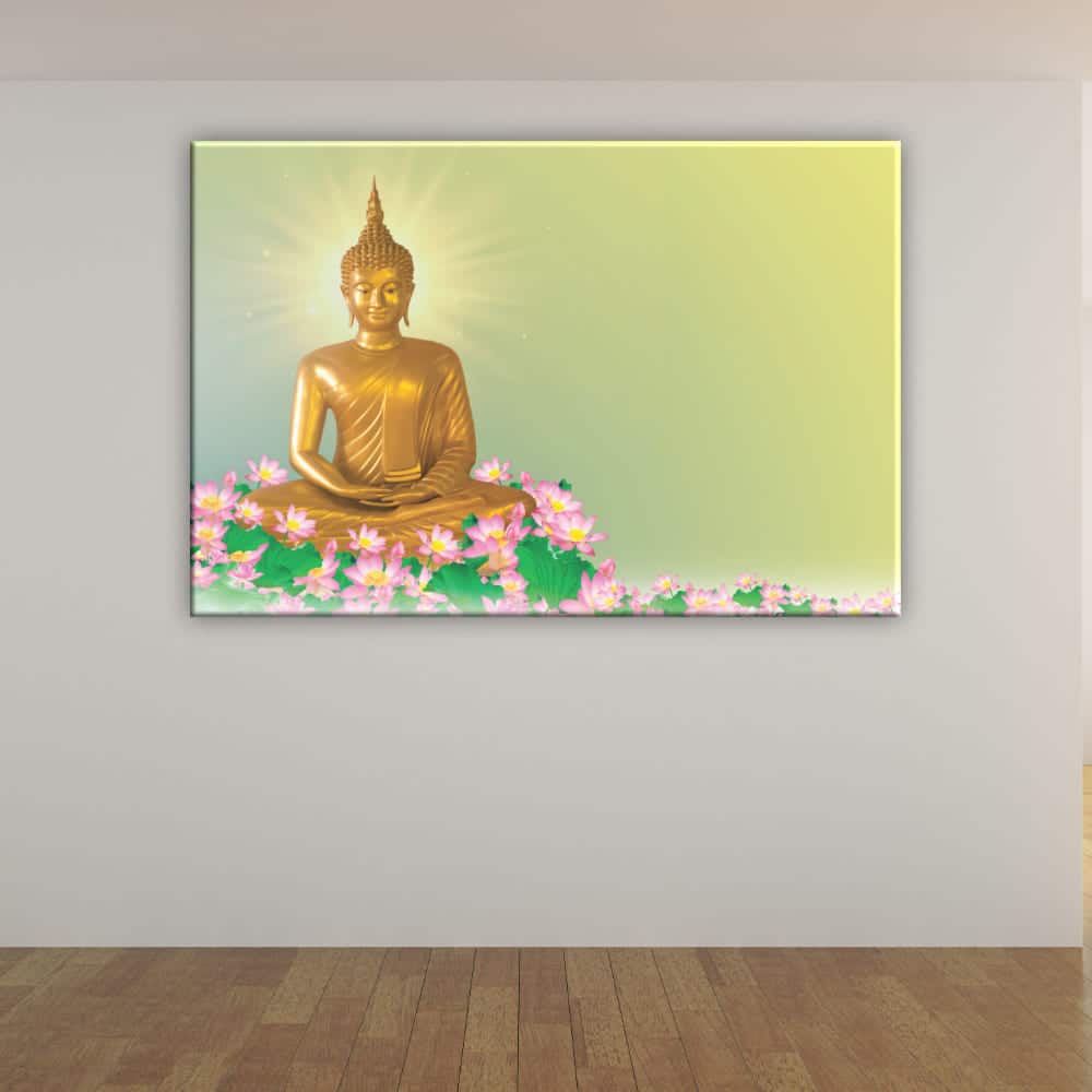 Den här målningen Buddha och rosa lotusblomma föreställer en Buddha-statuett med en vacker röd lotusblomma i bakgrunden, en blomma som förknippas med renhet. Den rosa färgen i den här målningen ger färg åt din inredning. Den här Buddha-statuetten kommer att bidra till lugnet och fridfullheten i din inredning.