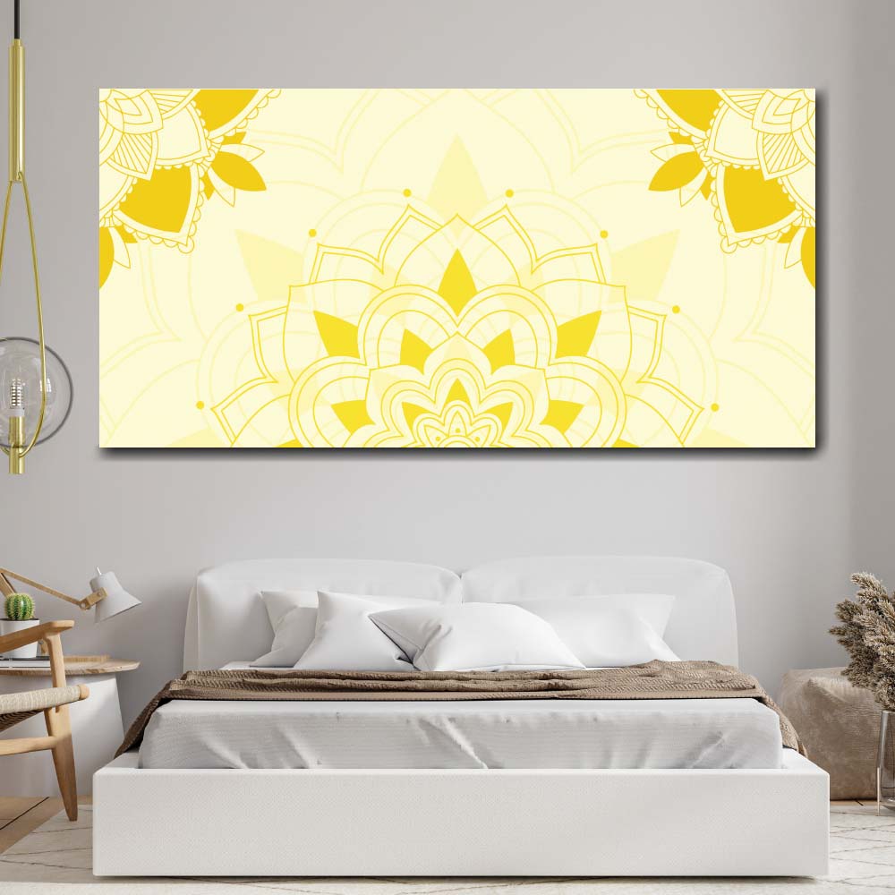Den gula mandalamålningen har en exakt design med välarbetade linjer. Den gula färgen, som är en symbol för rikedom, välstånd, fruktbarhet, ljus och värme, kommer att ge din inredning ett glatt utseende.
