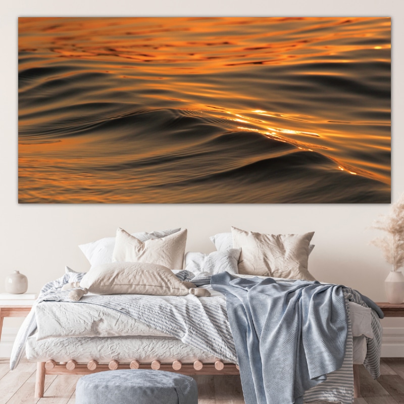 Låt dig överväldigas av en våg av välbefinnande och lugn med den här fotografiska reproduktionen i stort format, en fantastisk närbild av havets välgörande krusning som badar i ett mjukt gyllene ljus.